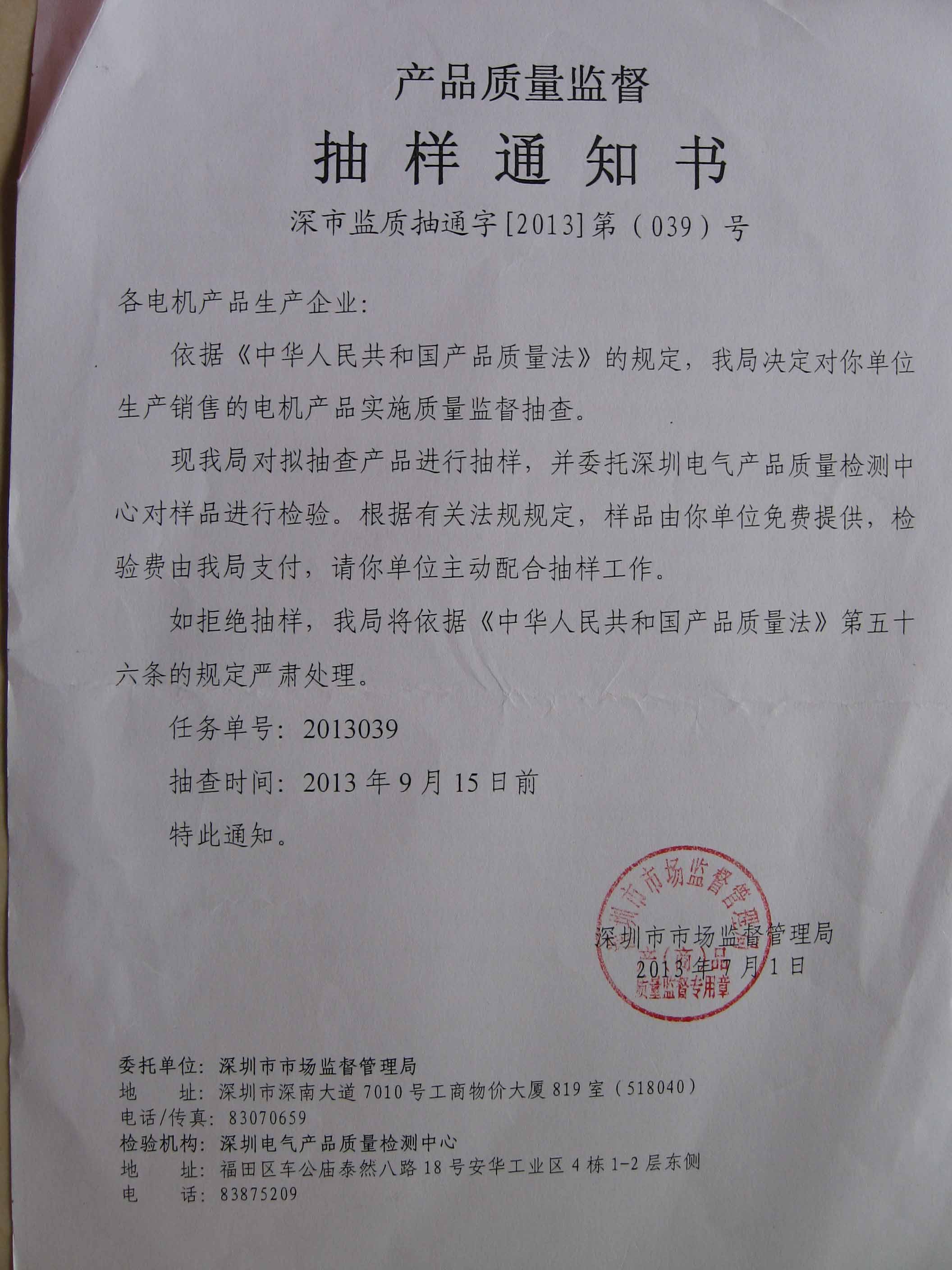 我司產品連續2年被深圳市質量技術監督局抽檢合格